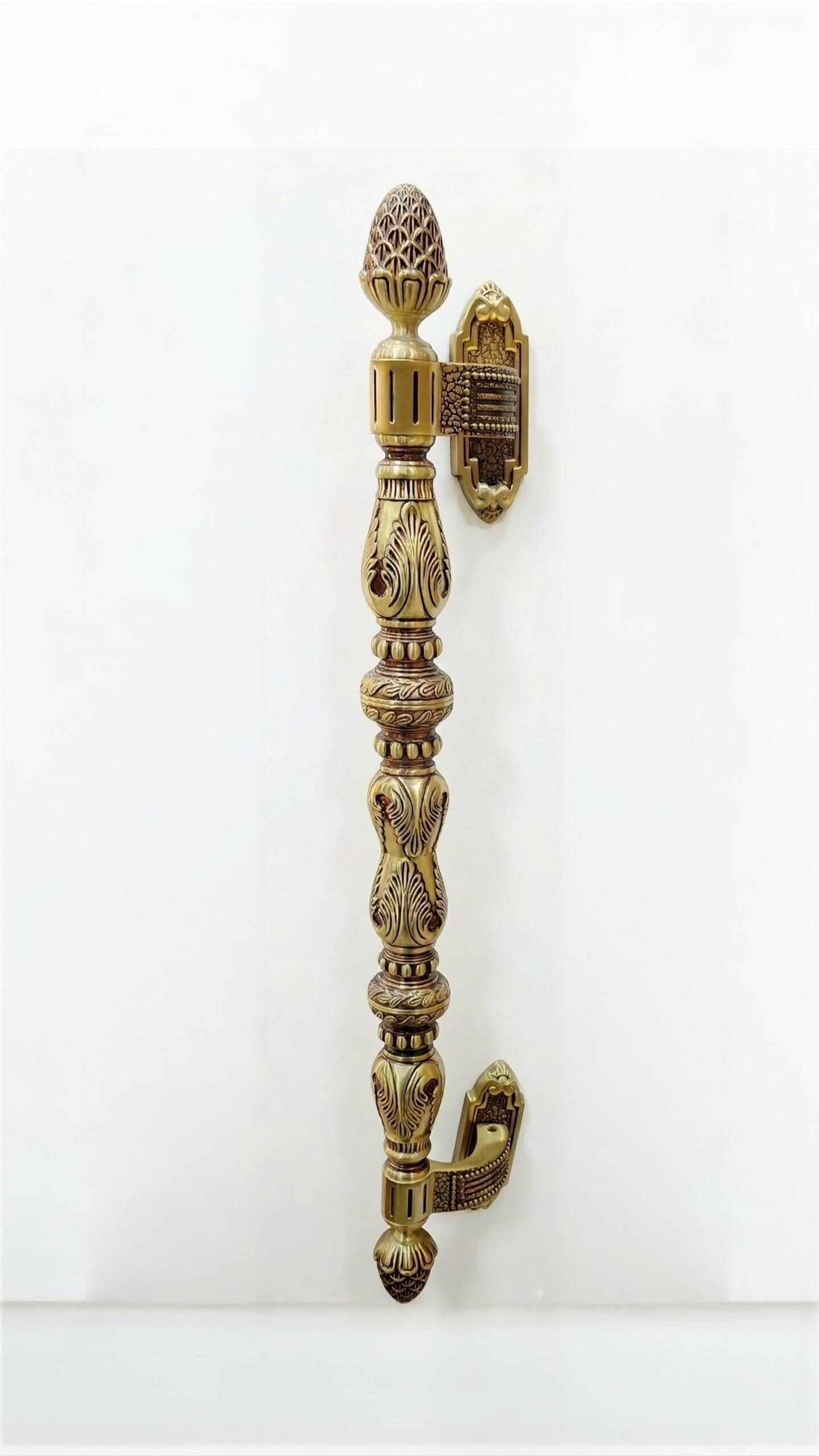 The polished brass finish has a subtle greenish-yellow tone with a reflective chrome-like shine, enhancing the handle’s premium look while highlighting its detailed craftsmanship. Its long vertical design provides a comfortable and firm grip, making it ideal for main entrance doors, glass doors, wooden doors, and aluminum doors.